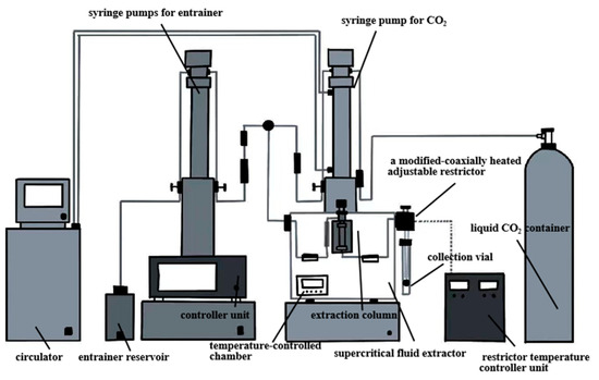 Supercritical fluid extraction (SFE) has garnered significant attention in the food and nutritional health product industries due to its high efficiency and environmentally friendly characteristics [54,55,59]. A supercritical fluid (SCF) is a unique phase of matter that exists above its critical temperature and pressure, where liquid and gas phases are indistinguishable. This state is particularly suitable for extraction processes [55]. Carbon dioxide is widely used as an SCF due to its inert nature, non-toxicity, recyclability, and low cost [57,59]. The apparatus used for SFE is shown in Figure 6. The high selectivity of the SCF is attributed to their tunable density [56]. The addition of a co-solvent further improves the precise extraction of target compounds [54]. Its high diffusion coefficient, low viscosity, and low surface tension enhance the penetration of solid matrices and increase extraction efficiency [59]. SFE is carried out at low temperature and in the absence of oxygen and light. These conditions effectively protect compounds that are heat-sensitive, have high boiling points, or are prone to oxidation [54]. Moreover, minimal solvent residue makes SFE an environmentally friendly extraction method [55].