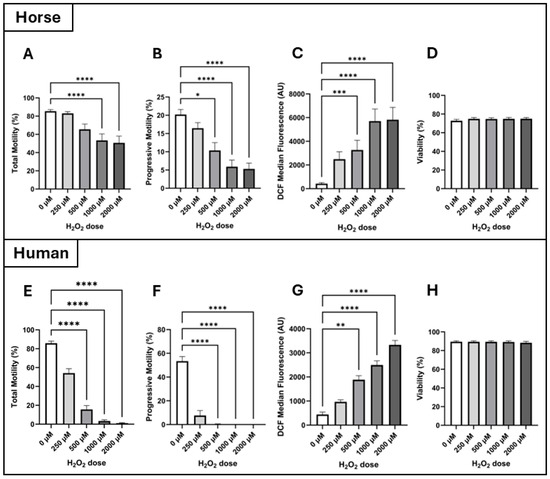 Motility: There was no significant interaction between incubation time and H2O2 dose on either total or progressive motility of spermatozoa from horses or humans, so these data were pooled across time points to show the isolated effect of H2O2 dose. All pairwise comparisons were made between the control (0 µM H2O2) and the individual H2O2 doses.