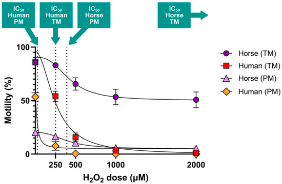 IC50 values: Human spermatozoa are more vulnerable to H2O2-initiated motility loss compared to horse spermatozoa (Figure 3). Horse spermatozoa total motility did not reach its IC50 at the doses utilised in the present study, so it can only be reported as being > 2000 µM. In contrast, human spermatozoa total motility met its IC50 at 251.9 µM H2O2. For progressive motility, the IC50 of horse spermatozoa was 391.6 µM H2O2, while the IC50 for human spermatozoa was 27.27 µM H2O2—more than 14-fold lower than that of the horse.