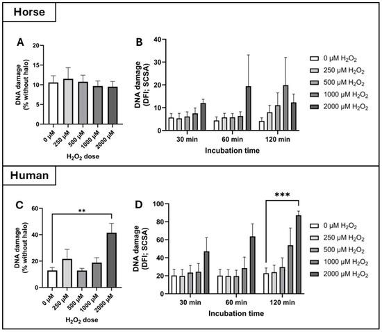Assessment of hydrogen peroxide-induced DNA damage in horse and human spermatozoa. Spermatozoa were treated with increasing concentrations of H2O2 (0, 250, 500, 1000, and 2000 µM), and DNA damage was evaluated using two complementary assays. (A) Horse sperm DNA fragmentation assessed by the halo assay, expressed as the percentage of spermatozoa without a halo. Data were pooled across time points due to the absence of a time-dependent effect. n = 12; (B) horse sperm DNA fragmentation index (DFI) measured using the sperm chromatin structure assay (SCSA) at 30, 60, and 120 min post-treatment. n = 4 per time point; (C) human sperm DNA damage assessed by the halo assay. Data were pooled across time points due to the absence of a time-dependent effect. n = 12 (D); human sperm DFI measured by SCSA at 30, 60, and 120 min post-treatment. n = 4 per time point. Significant difference from the control denoted by ** p ≤ 0.01 and *** p ≤ 0.001.