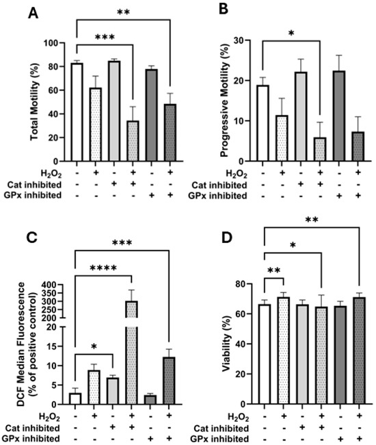 Motility: There were significant treatment effects on total motility (p ≤ 0.0001), progressive motility (p = 0.0015), viability (p ≤ 0.0001), and intracellular H2O2 concentrations (DCF fluorescence; p ≤ 0.0001). Total motility was significantly lower than the control only in the treatments which contained both antioxidant inhibitors and H2O2 (control: 83.1 ± 2.0%; catalase inhibition + H2O2: 34.4 ± 11.7%, p = 0.0004; glutathione peroxidase inhibition + H2O2: 48.5 ± 8.8%, p = 0.0041; Figure 5A). Progressive motility was significantly lower than the control only in the catalase inhibition + H2O2 treatment (control: 18.9 ± 1.9% vs. catalase inhibition + H2O2: 5.9 ± 3.7%, p = 0.021; Figure 5B).