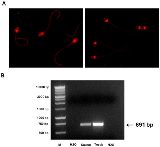 To confirm the presence of catalase transcripts in spermatozoa and testis tissue, 10 µg of total RNA was reverse transcribed using oligo(dT)15 primers (Promega Corporation, Annandale, NSW, Australia) and M-MLV Reverse Transcriptase (Promega). RT-PCR was performed to amplify equine catalase using gene-specific primers: forward 5′-ACTCCCATTGCGGTTCGATT-3′ and reverse 5′-TTGGGTCAAAGGCCAACTGT-3′, designed to yield a 691 bp product. PCR amplification was conducted on an Eppendorf EP Gradient S Thermocycler with the following cycling conditions: initial denaturation at 94 °C for 5 min; 35 cycles of 95 °C for 45 s, 57 °C for 45 s, and 72 °C for 2 min, followed by a final extension at 72 °C for 10 min. PCR products were resolved on 1.5% agarose gels and visualized using a Bio-Rad ChemiDoc™ Imaging System.