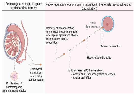 The role of redox regulation in major developmental stages of human spermatozoa. Mild oxidation is important in spermatogonia proliferation during spermatogenesis and chromatin condensation during epididymal maturation in the male reproductive tract. Sperm capacitation is one of the most redox-dependent processes that the spermatozoa must undergo to achieve fertilizing ability and depends on a mild (low) increase in oxidation of certain sperm proteins without altering their motility or viability. Oxidation promotes membrane fluidity and activation of several phosphorylation pathways. These effects endow the sperm with the ability to undergo hyperactivated motility and the acrosome reaction required to successfully fertilize the oocyte. (created in Biorender). https://app.biorender.com/illustrations/683a0eaf546f5abd34903600 (accessed on 3 June 2025).