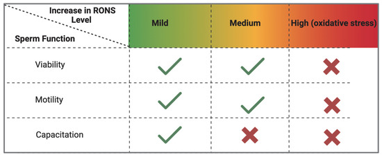 Effect of oxidation levels on sperm function during capacitation. An increase in RONS levels is necessary to initiate sperm capacitation. These levels are kept within mild (low) levels by peroxiredoxins whose catalytic cysteines undergo reversible oxidation to sulfenic acids. When peroxiredoxins are inhibited, there is an increase in RONS levels that impairs sperm capacitation. Absence of peroxiredoxins renders sperm incapable of controlling RONS levels, leading to non-specific oxidative stress, leading to impaired sperm viability, motility, and capacitation. (created in BioRender). https://app.biorender.com/illustrations/683a1635172c8b1ee82a83a6 (accessed on 3 June 2025).