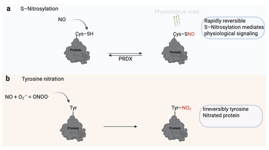 Dual Role of Nitric Oxide (NO) in Sperm Function. (a) S-nitrosylation involves the reversible addition of an NO group to the thiol (–SH) group of reactive cysteine residues, forming S-nitrosothiols (–SNO). This modification regulates protein activity, signaling, and localization and is rapidly reversible through enzymatic systems such as peroxiredoxins (PRDX). S-nitrosylation modulates physiological processes, including motility, capacitation, and the acrosome reaction. (b) Excessive or sustained NO reacts with superoxide (O2−) to form peroxynitrite (ONOO−), which irreversibly modifies tyrosine residues through nitration. Tyrosine nitration alters protein structure and function, often leading to impaired signaling, mitochondrial dysfunction, and reduced sperm motility. While S-nitrosylation serves as a physiological redox signal, tyrosine nitration is typically associated with nitrosative stress and male infertility. Created in BioRender. https://app.biorender.com/illustrations/681527a353b88e93b9976da4, accessed 3 June 2025.