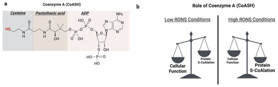 Role of protein S-CoAlation. (a) Coenzyme A (CoASH) is composed of adenosine diphosphate (ADP), pantothenic acid, and cysteine. Its reactive thiol group on the cysteine moiety underlies its classical metabolic roles and function in redox regulation through protein CoAlation. (b) Under basal physiological conditions, CoASH primarily functions as a metabolic cofactor in fatty acid metabolism and the TCA cycle processes. However, under oxidative stress, CoASH is increasingly diverted toward antioxidant defense by forming mixed disulfides with protein cysteine residues, a reversible modification known as protein CoAlation. Created in BioRender. https://app.biorender.com/illustrations/681527a353b88e93b9976da4, accessed 3 June 2025.