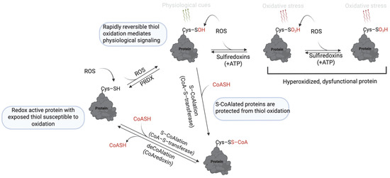 During oxidative stress conditions, the function of CoASH shifts from metabolic and redox regulation to antioxidant function [134]. The molecular mechanisms are proposed to be analogous to glutathionylation involving a CoA-S-transferase to catalyze the forward reaction, an unknown CoA-redoxin to catalyze deCoAlation, CoA-peroxidase to scavenge ROS, and CoA-disulfide reductase to reduce oxidized CoASSCoA [134] (Figure 7). Increased protein CoAlation has been observed in diverse systems, including mammalian cells [127], prokaryotes, including bacteria [135], and amoeba [136] after exposure to oxidants (Table 2). This modification affects a broad range of proteins, including metabolic enzymes [137], transcription factors [138], antioxidant enzymes [139], cell cycle regulators [133], and signaling kinases [129].