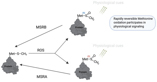 Oxidation may also occur selectively at methionine residues in proteins, although less frequently than cysteine oxidation [182]. Rosenfeld et al. (2021) [183] and Aledo (2019) [182] recently provided comprehensive reviews on the mechanisms and biological roles of methionine oxidation. Upon exposure to oxidants such as hydrogen peroxide (H2O2) and hypochlorous acid (HOCl), methionine residues are oxidized to methionine sulfoxide (MetO). This reaction can be catalyzed by the MICAL family of monooxygenases [184]. The oxidation of MetO is reversible and stereospecific, catalyzed by two distinct enzymes: methionine sulfoxide reductase A (MSR-A), which reduces the S-stereoisomer, and methionine sulfoxide reductase B (MSR-B), which reduces the R-stereoisomer [185] (Figure 8).