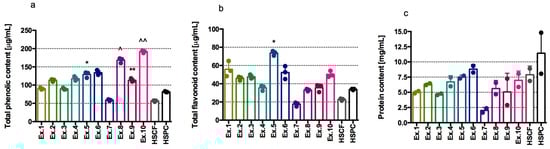 Content of phenolic compounds (a), flavonoid compounds (b), protein (c) in tested extracts Results from three separate experiments in duplicate are presented as mean ± SD, Kruskal-Wallis’s test, Dunn’s post hoc; differences vs. HSCF were considered at * p < 0.05, ** p < 0.01, differences vs. HSPC were considered at ^ p < 0.05, ^^ p < 0.01; Ex.1 = HSCF_XL20; Ex.2 = HSPC_XL20; Ex.3 = HSCF_XL30; Ex.4 = HSPC_XL30; Ex.5 = HSCF_XL40; Ex.6 = HSPC_XL40; Ex.7 = HSCF_FP; Ex.8 = HSPC_FP; Ex.9 = HSCF_FP_DL; Ex.10 = HSPC_FP_DL.