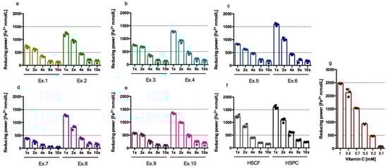 Reductive/antioxidant activity of extracts (FRAP test), Ex.1 = HSCF_XL20, Ex.2 = HSPC_XL20 (a); Ex.3 = HSCF_XL30, Ex.4 = HSPC_XL30 (b); Ex.5 = HSCF_XL40, Ex.6 = HSPC_XL40 (c); Ex.7 = HSCF_FP, Ex.8 = HSPC_FP (d); Ex.9 = HSCF_FP_DL, Ex.10 = HSPC_FP_DL (e); HSCF, HSPC (f); vitamin C (g); Results from three separate experiments in duplicate are presented as mean ± SD.