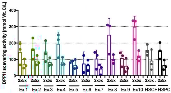 DPPH scavenging/antioxidant activity of extracts (DPPH test). Results from three separate experiments in duplicate are presented as mean ± SD; 2×, 5×—dilution of extract; Ex.1 = HSCF_XL20; Ex.2 = HSPC_XL20; Ex.3 = HSCF_XL30; Ex.4 = HSPC_XL30; Ex.5 = HSCF_XL40; Ex.6 = HSPC_XL40; Ex.7 = HSCF_FP; Ex.8 = HSPC_FP; Ex.9 = HSCF_FP_DL; Ex.10 = HSPC_FP_DL.