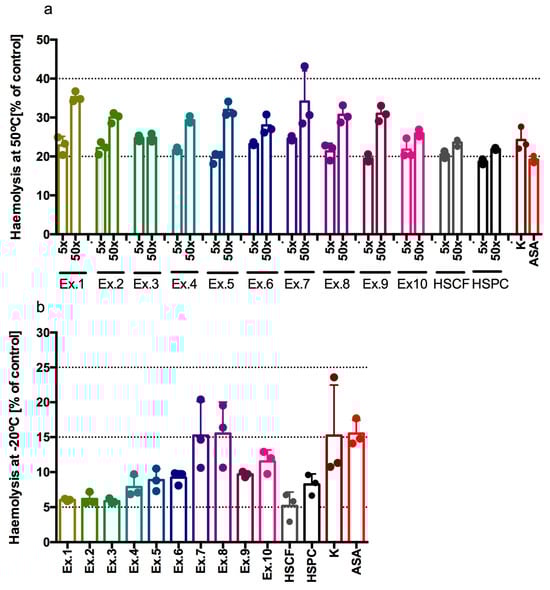 Haemolysis after incubation of extracts with red blood cells in (a) high temperature (50 °C), extracts diluted 5× and 50×; and (b) low temperature (−20 °C), extracts diluted 50×. Results from three separate experiments in duplicate are presented as mean ± SD; Ex.1 = HSCF_XL20; Ex.2 = HSPC_XL20; Ex.3 = HSCF_XL30; Ex.4 = HSPC_XL30; Ex.5 = HSCF_XL40; Ex.6 = HSPC_XL40; Ex.7 = HSCF_FP; Ex.8 = HSPC_FP; Ex.9 = HSCF_FP_DL; Ex.10 = HSPC_FP_DL, K—ketoprofen 1mM; ASA—aspirin 2mM.