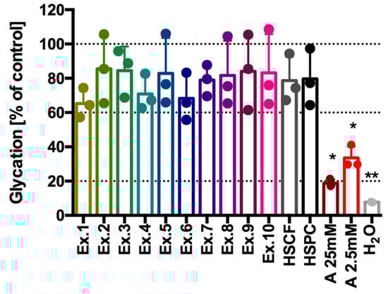 The formation of glycated BSA was determined according to the modified method described by Nicosia et al. []. In brief, 1 mL of BSA (30 mg/mL in 100 mM sodium phosphate buffer, pH 7.4, containing 0.02% sodium azide to prevent bacterial growth) was incubated with 1 mL of 1.5 M fructose (in 100 mM sodium phosphate buffer, pH 7.4) and 1 mL of the tested extracts. A control sample was prepared using BSA, fructose, plus water. A blank was prepared using only BSA, buffer, plus water. The reaction mixtures were incubated at 37 °C for fourteen days and were afterwards assayed to determine the presence of advanced glycation. Aminoguanidine was used as a reference compound.