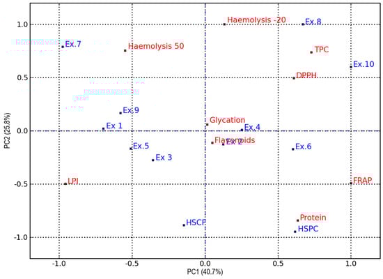 HSPC and hydrolysed-HSPC extracts had a protein content higher than HSCF and hydrolysed-HSCF. The highest amount of protein was determined in HSPC, HSPC_XL40, HSCF, and HSCF_XL40 extracts. The results are presented in Figure 1c.