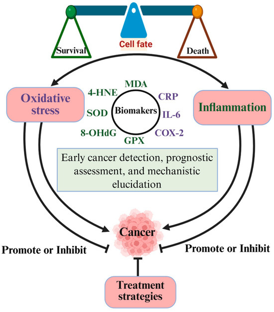 This review emphasizes current knowledge regarding the oxidative stress–inflammation axis, emphasizing its dual regulatory roles throughout tumor initiation, progression, and therapy resistance. We discuss mechanistic insights into their crosstalk, highlight diagnostic and prognostic biomarkers, and critically assess therapeutic strategies aimed at breaking the pro-tumorigenic cycle. Future studies should focus on designing precise medicines based on patient-specific biomarkers given the heterogeneity of tumors. Ultimately, targeting this dual axis offers a transformative opportunity to overcome therapeutic limitations and improve patient outcomes.