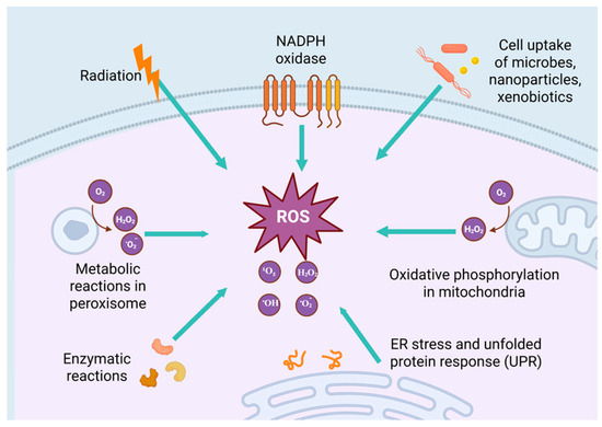 Elevated ROS levels are associated with many factors. In the process of mitochondrial oxidative phosphorylation, when the electron transport chain (such as complex I and III) is dysfunctional, electrons easily combine with oxygen to form O2•−, which in turn converts to H2O2 and other ROS. NADPH oxidase is a transmembrane enzyme complex. Its core function is to catalyze the transfer of electrons from NADPH to oxygen to generate O2•−, which is further converted to H2O2, OH•, and other ROS. Cellular uptake of microorganisms, nanoparticles, and xenobiotics is an important physiological process for organisms to cope with external stimuli. However, the intracellular responses triggered by the uptake of microorganisms, nanoparticles, and xenobiotics are often accompanied by ROS generation and oxidative stress. Radiation can directly damage DNA, lipids, and proteins and induce cells to produce ROS. Peroxisomes play a key role in maintaining cellular REDOX homeostasis by catalyzing the generation and scavenging of ROS, the balance of oxidative metabolic pathways, and the interaction with other organelles. Enzymatic reactions generate ROS (such as 1O2, O2•−, H2O2 and OH•) through catalytic processes, disrupting cellular redox balance and leading to oxidative stress. ER stress and unfolded protein response interfering with steady-state, metabolic balance, and intracellular calcium signaling pathways ultimately lead to ROS excess generation. Created with BioRender.com.