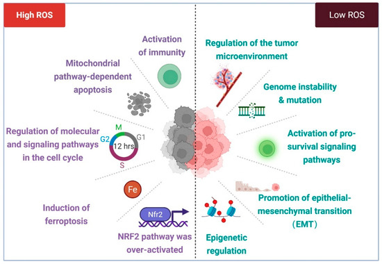 ROS in cancer biology. Excessive levels of ROS can inhibit tumor growth by triggering apoptosis, ferroptosis, or cell cycle arrest and even activate immune cells to recognize abnormal cells. In addition, it can inhibit the occurrence and development of tumors by activating Nrf2. However, relatively low levels of ROS can lead to genomic instability or mutation, thereby inducing the activation of proto-oncogenes or the inactivation of tumor suppressor genes and promoting the transformation of normal cells into precancerous lesions. At the same time, low levels of ROS can also promote the occurrence and development of cancer by activating pro-survival signaling pathways, promoting epithelial–mesenchymal transition and regulating epigenetics. Created with BioRender.com.