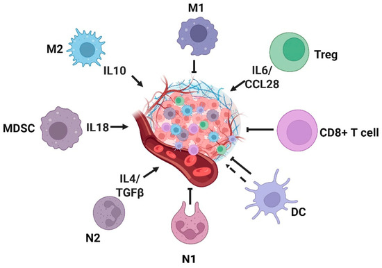 Similarly to tumor-associated neutrophils, TAMs can be classified into distinct subtypes, including M1-type macrophages and M2-type macrophages [163], with their polarization determined by molecular cues within the TME. Tumor cells use the plasticity of macrophages to secure their survival. In the early stages of tumor development, macrophages polarize towards the M1 phenotype, showing anti-tumor responses; however, in advanced stages, they shift towards the M2 phenotype to promote tumor progression [164]. This shift in polarization probably reflects variations in the molecular composition of TME across different phases of tumor development. Studies demonstrate that cytokines, such as IL-4, M-CSF/CSF1, IL-10, IL-33, IL-21, and TGF-β, drive TAMs towards the M2 phenotype, whereas M1-type TAMs are activated by TNF-α or GM-CSF [138]. M1 macrophages exert anti-tumor effects through multiple mechanisms, including inducing direct cytotoxicity via the secretion of ROS and NO [165] and mediating antibody-dependent cell-mediated cytotoxicity (ADCC) [166]. Conversely, M2 macrophages predominantly facilitate tumor progression by activating endothelial cell responses to growth factor signaling via CXCL12, IL-1β, IL-8, and Sema4d, thereby leading to the upregulation of angiogenesis-related genes and enhanced vascularization [167,168,169]. Additionally, M2 TAMs assist in tumor invasion and metastasis by indirectly degrading the tumor extracellular matrix [170].