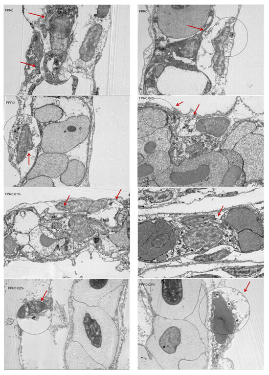 Table 3 presents the ion concentrations of plasma and Na+/K+-ATPase activity of liver following a 12 h hypoxia stress. Compared with the control group, the 0.01% and 0.02% FPR supplementation significantly improved the activity of Na+/K+-ATPase in liver and concentration of Na+ in plasma, respectively (p < 0.05). The 0.02% FPR supplementation significantly lowered the concentration of K+ (p < 0.05). Concurrently, the significantly decreased concentrations of Ca+ were presented in 0.02% and 0.03% FPR supplementation (p < 0.05). Furthermore, the concentration of Cl− was not found to change significantly in the FPR supplementation (p > 0.05).
