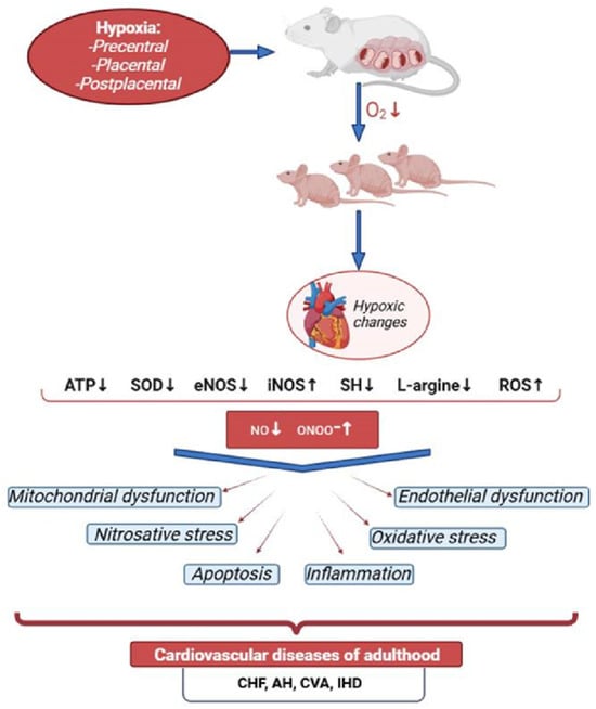 Prenatal hypoxia and its effects on the cardiovascular system of the fetus and offspring. PH causes disruption in the nitric oxide (NO) system, leading to NO deficiency, increased reactive oxygen species (ROS) and their cytotoxic forms, and the activation of NO-dependent molecular–biochemical mechanisms that lead to apoptosis, endothelial dysfunction, mitochondrial dysfunction, inflammation, oxidative stress, and nitrosative stress. This initiates the foundation for the development of cardiovascular diseases in adulthood (chronic heart failure (CHF), arterial hypertension (AH), cerebrovascular accident (CVA), ischemic heart disease (IHD)). Arrows indicate increase and decrease.
