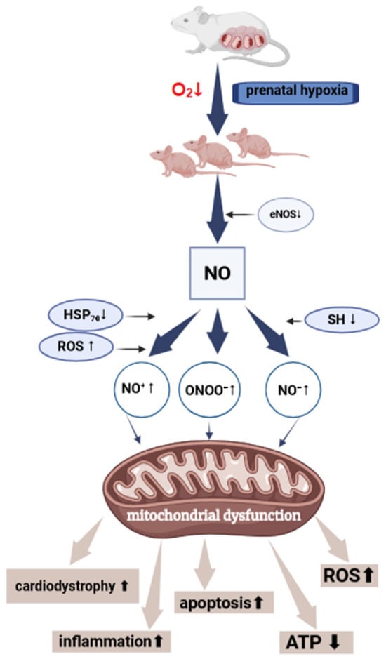 PH is also known to impair electron transfer between cytochrome c and oxygen within cardiac mitochondria, contributing to mitochondrial dysfunction. This impairment manifests as reduced stroke volume and cardiac output in male offspring [171]. Additionally, PH downregulates the expression of mitochondrial transcripts, including peroxisome proliferator-activated receptor gamma coactivator 1-alpha (PGC-1α), cytochrome c oxidase subunit II (COXII), and uncoupling proteins. This reduction compromises mitochondrial respiratory efficiency in the hearts of affected offspring [172]. It is known that NO can serve as a natural short-term regulator of mitochondrial physiology, enhancing the efficiency of oxidative phosphorylation in redox processes by reducing errors and failures in proton pumps [173]. Therefore, its deficiency due to PH may lead to disruptions in oxidative processes in mitochondria.
