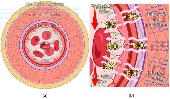 The structure of arteria. (a) The main areas that form a blood vessel are the lumen including the blood flow and three tunics (intima, media, adventitia). The last ones include well-described anatomical elements []. ESG is a part of the lumen, and it lines the internal boundary of the endothelium. IEL covers the external boundary of the tunica intima, being a part of it. (b) A schematic illustration of NO production in the endothelium and its farther convectional reaction–diffusion into the tunica media and the blood flow. Created in https://BioRender.com (accessed on 24 January 2025).