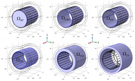 The phantom of the considered area is designed as a set of inserted shot pipes surrounding the central cylinder. The last one is associated with a blood stream in the central vessel’s lumen (). The next external covering pipe corresponds to ESG (). Then, the sequence of covers is as follows: the endothelium (), the basal lamina (), the rest space in the tunica intima (), IEL (), the tunica media (), and the tunica adventitia (). They are created by placing the appropriate cylinders with the same central axis orientation and initial coordinates. These basic geometric elements make up the assortment of inserted forms that are ultimately utilized to establish the modelling areas (Figure 2).