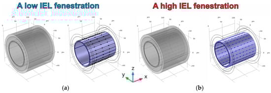 where is the cylinder with the diameter and the axis orthogonal to the central axis of . To deal with the difference in IEL fenestration, two cases are considered in the phantom design. The first one is associated with a low IEL fenestration, accomplished as three symmetric rings of pores penetrating IEL (Figure 3a). The direction of penetration is orthogonal to the central axis of the IEL pipe’s domain. The case of high fenestration is related to seven symmetric rings of pores (Figure 3b).