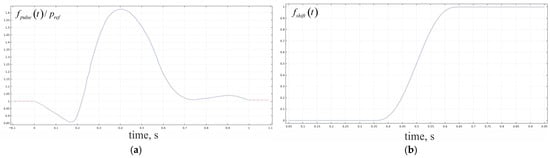 The dimensionless functions, which are used for the governing of the blood pressure time dependence. The considered cases correspond to a pulse wave (a) and a shift in pressure (b).