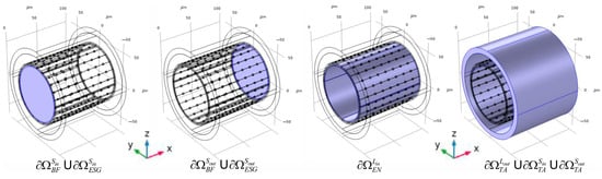 All longitudinal boundaries of the pipes () form the internal surfaces in the phantom. In the case of convectional reaction–diffusion, there are no boundary conditions on them. The exception is the external boundary of the tunica adventitia () because this surface is a part of the external boundary of the phantom (). However, the conditions are set up in the case of convection because there is a separate area for the blood flow and interstitial fluid. The side boundaries () have defined conditions for both diffusion and convection.