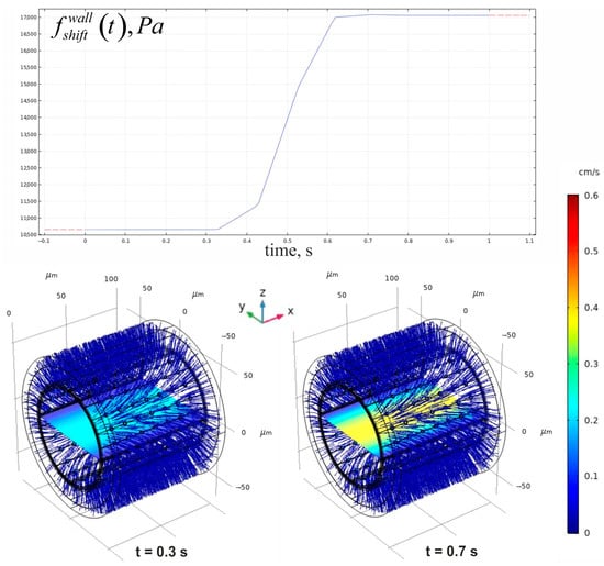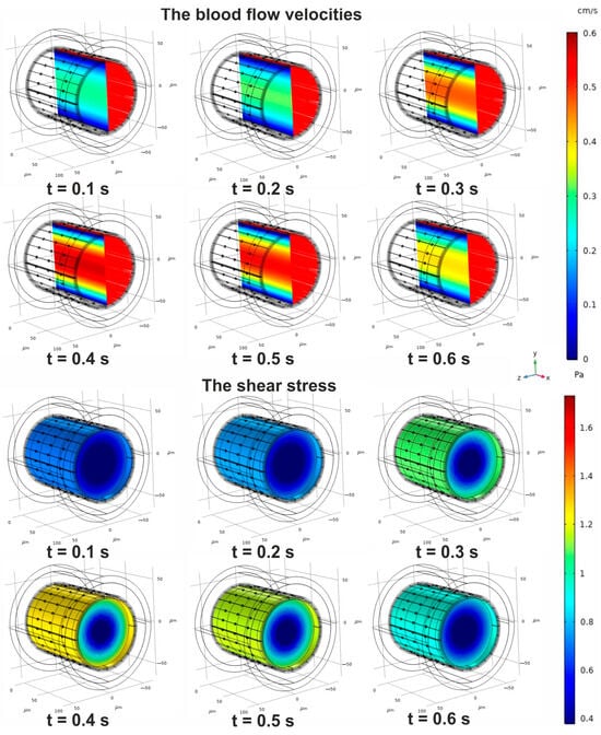 The convectional velocity field is obtained in all domains of the phantom. Nevertheless, the first result should be the solution of the Navier–Stokes equation with the boundary conditions because to solve the problem for Equation (5), one needs to obtain a numeric estimation of the wall pressure on . The time-dependent images for the velocities and the shear stress in the blood stream () and ESG () are represented in Figure 6. Both variables are governed by the function , with an increasing/decreasing amplitude in time. One can observe a distribution of velocity rates in the blood circulation and ESG, characterized by a typical increase in amplitude near the central axis. Indeed, the time-dependent behaviour of the shear stress aligns with the governing pressure function, and the same results can be gained in the case of .