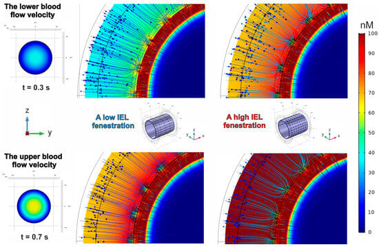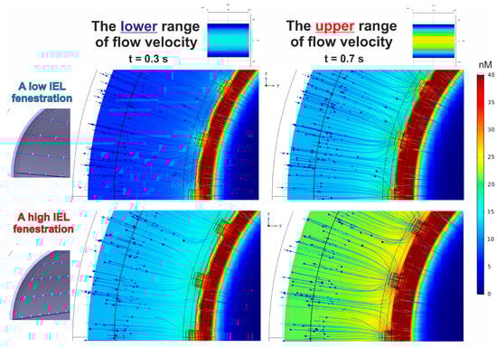 The convectional variables for and domains in the case of a shift in pressure. In the upper panel, is shown. The bottom segment of the figure exposes two sets of velocity distributions associated with both low and high pressures in the vessel. The distributions are illustrated by the pattern of the central plane in and domains. The blue arrows that outline the regions depict the streamlines of convective velocities based on Darcy’s law in the blood vessel wall. The represented geometry corresponds to a high level of IEL fenestration.