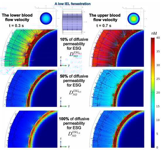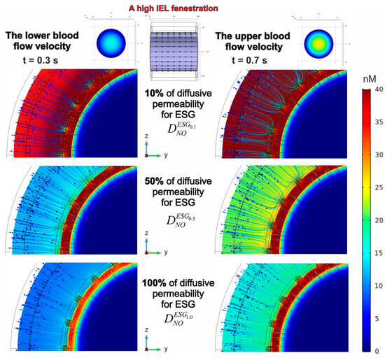 In general, one can see that, in most instances, the endothelium () contains the greatest concentration of NO exceeding 40 nM, although there is one notable exception. If the diffusive permeability of ESG aligns with that of other domains in the phantom (except for ), the amplitude of NO spatial concentration distribution decreases to 35 nM under a low blood flow (Figure 9 and Figure 10; bottom/left). Although the distribution patterns of NO concentrations are wholly shaped by the fenestration characteristics of the IEL, the enhanced blood flow velocity rather than the increased quantity of pores in the IEL restores the NO levels in the endothelium (Figure 9 and Figure 10; bottom/right).