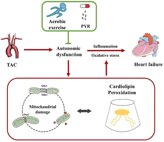 Aerobic exercise ameliorates heart failure by regulating mitochondrial damage and cardiolipin peroxidation through autonomic dysfunction. TAC, transverse aortic constriction; PYR, pyridostigmine.