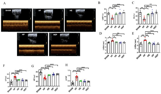 Consistent with the study results, heart failure leads to autonomic neuropathy and a decrease in parasympathetic activity. Heart rate variability (HRV) reflects the time between adjacent heartbeats and can reflect the regulatory role of the autonomic nervous system. The HRV analysis calculated by electrocardiogram (Figure 2) showed that LF (nu) was significantly increased (p < 0.01) in the HF group compared to the SHAM group, and LF (nu) was significantly reduced (p < 0.01) in the HE, HP, and HEP groups compared to the HF group. HF (nu) was significantly reduced (p < 0.01) in the HF group compared to the SHAM group, and HF (nu) was significantly increased (p < 0.01) in the HE, HP, and HEP groups compared to the HF group. As expected, aerobic exercise and pyridostigmine intervention significantly improved autonomic neuropathy in heart failure and inhibited the decrease in parasympathetic activity.