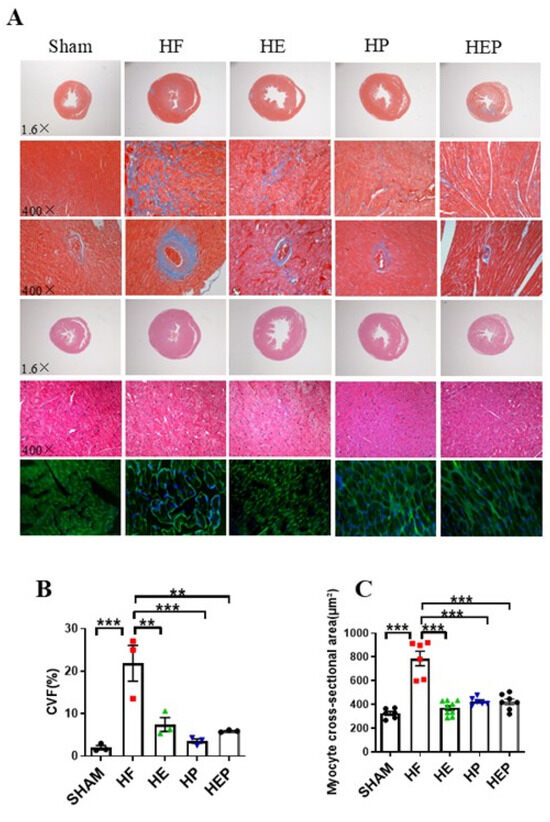 In addition to left ventricular systolic dysfunction, heart failure can lead to left ventricular hypertrophy and fiberization. Masson staining results (Figure 3) showed normal myocardial cell morphology in the SHAM group, with almost no collagen fibers between cells and normal vascular tissue. In contrast, cardiomyocytes in the HF group exhibited disorganization, extensive blue collagen fiber deposition, and pronounced fibrosis, particularly near blood vessels. Statistical results indicated that TAC-induced heart failure led to severe myocardial fibrosis and extensive myocardial cell hypertrophy. Compared to the HF group, the heart and vascular fibrosis and pathological tissue morphology in the HE, HP, and HEP groups improved significantly. The myocardial cell cross-sectional area was measured using HE and WGA staining. These results indicated that aerobic exercise and pyridostigmine intervention significantly attenuated miocardial fibrosis and myocardial hypertrophy and improved pathological remodeling of the myocardium in heart failure.