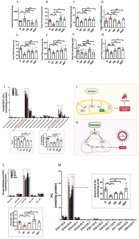 Analysis of CL acyl composition in the heart by electrospray ionization (ESI)/MS. Aerobic exercise restores lipidomic disturbances and cardiolipin acyl composition in left heart cardiomyocytes of heart failure mice. (A–H) The levels of total PA, PG, CL, 4-HNE, PE, PC, PS, and SM. (I–K) Exercise restored the levels of TLCL and CL (22:6). (L,M) Exercise restored the PG level concurrently with increased PG (16:0–18:1) and PC (D18:0–22:6). Exercise modulates mitochondria-associated dynamics-related proteins through lipidomics to inhibit lipid peroxidation and ameliorate heart failure. (I,L,M) used the same groups of sham, heart failure, HE, HP, and HEP; n = 3–5 per group. Data are expressed as mean ± SD. *, p < 0.05; **, p < 0.01; ***, p < 0.001, NS means not significant.