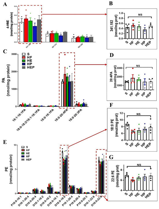 Aerobic exercise can regulate lipidomic disturbances and cardiolipin acyl composition in left heart cardiomyocytes of heart failure mice. (A,B) Exercise can regulate the levels of 4-HNE and 4-HNE (341.82) and the levels of PA and PA (20:4PA) (C,D). (E–G) Aerobic exercise regulated the cardiac PE and PE (18:0 PE) and PE (22:6 PE) level. (A,C,E) used the same groups of sham; heart failure; and HE, HP, and HEP groups; n = 3–5 per group. Data are expressed as mean ± SD. NS means not significant.