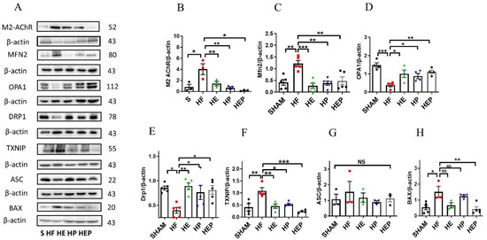 Moreover, aerobic exercise and pyridostigmine interventions decrease myocardial inflammation and oxidative stress resulting from mitochondrial dysfunction. Western blotting results (Figure 6F–H) showed that TXNIP protein expression was significantly upregulated in the HF group compared to the SHAM group (p < 0.05) and significantly downregulated in the HE, HP, and HEP groups compared to the HF group (p < 0.01, p < 0.05, p < 0.001). ASC protein expression was upregulated in the HF group compared to the SHAM group and downregulated in the HE, HP, and HEP groups compared to the HF group. BAX protein expression was significantly upregulated in the HF group compared to the SHAM group (p < 0.05) and downregulated in the HE and HEP groups compared to the HF group. The results indicated that under pathological conditions, the levels of inflammation and apoptosis in myocardial tissue were high. Aerobic exercise and pyridostigmine intervention could reduce inflammation and apoptosis in heart failure, diminishing the area of myocardial fibrosis in mice with heart failure.