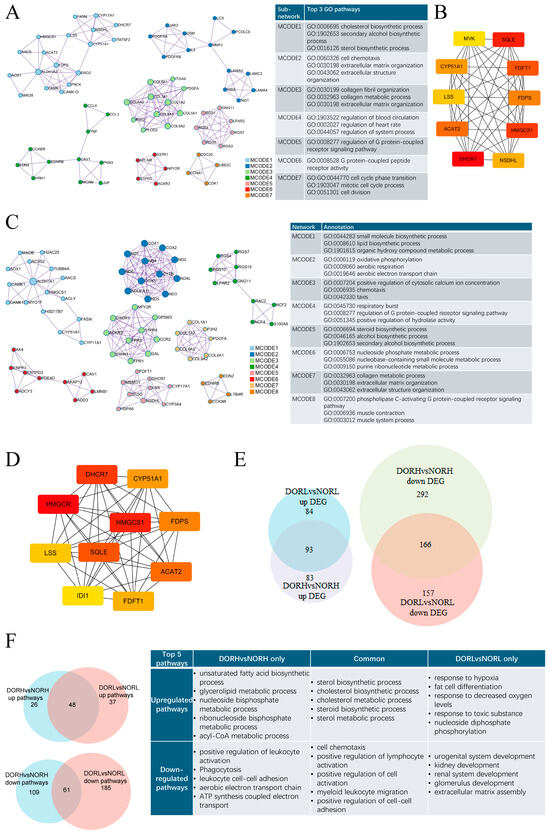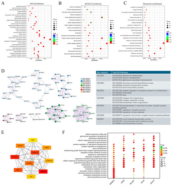 Seven key sub-networks were detected from the PPI network of differentially expressed genes (DEGs) in DOR vs. NOR using MCODE analysis (Figure 1D). Based on the GO pathway analysis, these seven modules are associated with glomerulus development, cholesterol biosynthetic process, sterol biosynthetic process, collagen metabolic process, extracellular matrix organization, phospholipase C-activating G protein-coupled receptor signaling pathway, regulation of G protein-coupled receptor signaling pathway, lipid biosynthetic process, etc. Figure 1E shows the hub genes, which include HMGCR, HMGCS1, SQLE, DHCR7, CYP51A1, and FDPS, which are the genes in the cholesterol synthesis pathways. Potential transcriptional factors (TFs) of the DEGs were predicted using ChEA3. Figure 1F shows the potential TFs and the GO pathways of their target genes.