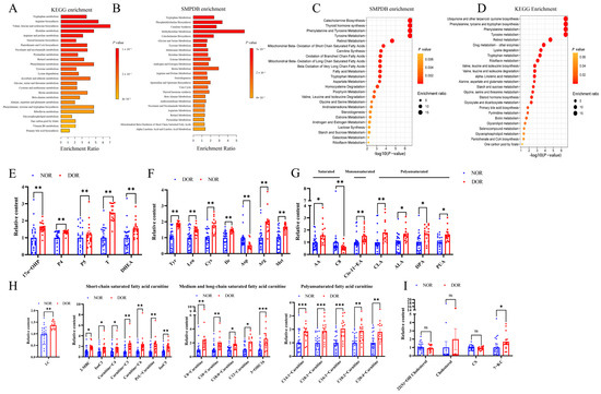 MSEA analysis using the QEA method showed that mitochondrial ß-oxidation of short chain saturated fatty acids, carnitine synthesis, oxidation of branched chain fatty acids, mitochondrial β oxidation of long-chain saturated fatty acids, β oxidation of very long chain fatty acids, androstenedione metabolism, steroidogenesis, estrone metabolism, and androgen and estrogen metabolism were enriched in the DOR group compared to the NOR group based on the SMPDB database (Figure 3C), and phenylalanine metabolism, phenylalanine, tyrosine, tryptophan biosynthesis, tyrosine metabolism, retinol metabolism, drug metabolism-other enzymes, lysine degradation, tryptophan metabolism, riboflavin metabolism, etc., were enriched in the DOR group based on the KEGG database (Figure 3D).