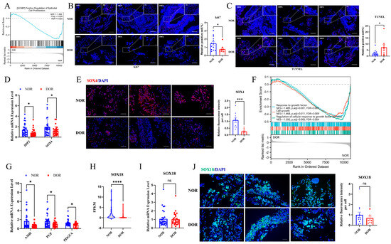 GSEA showed that positive regulation of epithelial cell proliferation was downregulated in the DOR group (Figure 4A). We confirmed that Ki67 staining was significantly decreased whilst TUNEL staining was significantly increased in the DOR group (Figure 4B,C). The mRNA levels of JDP2, a transcriptional factor (TF) of repressing apoptosis, and SOX4, a TF related to GC proliferation and survival, were reduced in the DOR group compared to the NOR group (Figure 4D). SOX4 protein expression was robustly decreased in the DOR group compared to the NOR group (Figure 4E).