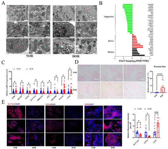 We then analyzed the expression of the DEGs related to ferroptosis in DOR/NOR using the ferroptosis database FerrDb (http://www.zhounan.org/ferrdb/, accessed on 15 May 2024) [18] and KEGG database (https://www.kegg.jp/, accessed on 15 May 2024). Figure 5B showed the genes linked to ferroptosis, including SLC7A11, GPX4, FADS1, FADS2, LOX, IDH1, DUOX2, LPCAT3, SLC40A1, JUP, etc., in DEGs of DOR/NOR patients in transcriptome analysis. We then confirmed that TFR2 and DUOX2 mRNA levels were increased, whereas GPX4 and SLC7A11 levels were decreased in DOR patients (Figure 5C). In MBOAT2, JUP, and PDGFRB, the endogenous ferroptosis suppressor, mRNA levels were downregulated, while in NCOA4, a factor promoting ferroptosis, and lysyl oxidase (LOX), a novel contributor of ferroptosis, mRNA expression levels were upregulated in the DOR group compared to the NOR group (Figure 5C).