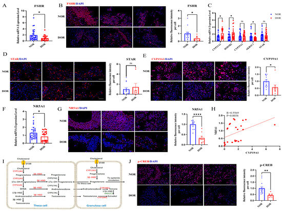 Reduced FSHR signaling and changed expression of the key enzymes in steroid hormone in GCs of DOR patients. GCs collected from 34 NOR women and 27 DOR women were used for Q-PCR validation, and GCs from 12 NOR women and 9 DOR women were used for IF staining. (A) The mRNA levels of FSHR were determined by Q-PCR. (B) Representative images of IF staining of FSHR (left, 400×) and the cumulative diagram of relative fluorescence intensity/cell (right). (C) The mRNA levels of CYP11A1, HSD3B2, CYP19A1, AKR1C3, and STAR were determined by Q-PCR. (D) Representative images of IF staining of STAR (left, 400×) and cumulative diagram of relative fluorescence intensity/cell (right). (E) Representative images of IF staining of CYP19A1 (left, 400×) and cumulative diagram of relative fluorescence intensity/cell (right). (F) The mRNA levels of NR5A1 were determined by Q-PCR. (G) Representative images of NR5A1IF staining (left, 400×) and the cumulative diagram of relative fluorescence intensity/cell (right). (H) The correlation between NR5A1 mRNA expression and CYP19A1 mRNA expression. (I) Schematic map of steroidogenesis in ovary. Red letters indicate regulation; green letters indicate downregulation. (J) Representative images of IF staining of p-CREB (left, 400×) and the cumulative diagram of relative fluorescence intensity/cell (right). The data are expressed as mean ± SEM. ns:No Significant, * p < 0.05, ** p < 0.01, **** p < 0.0001.