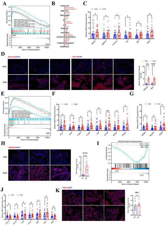 The mRNA level of SREBF2, the key TF in regulation of cholesterol and fatty acid synthesis, was significantly upregulated in the DOR group compared to the NOR group (Figure 7G). Other TFs associated with the fatty acid biosynthesis and metabolism process MLXIPL mRNA level and the TFs related to steroid biosynthesis and fatty acid homeostasis NR1H4 mRNA level were also significantly increased in DOR patients (Figure 7G). Figure 7H shows that SREBF2-positive staining was significantly increased in DOR patients compared to the NOR group.