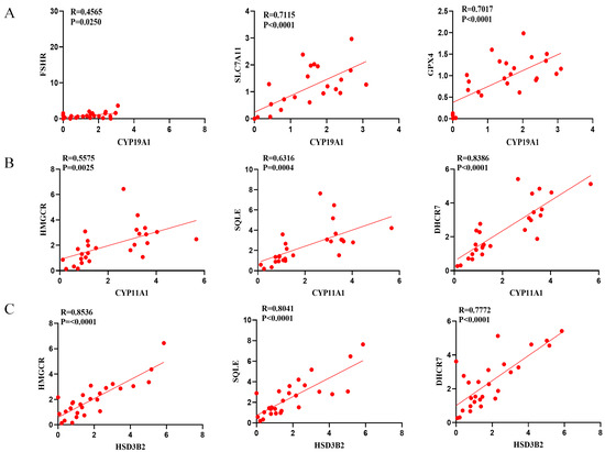 The correlations of CYP19A1 and FSHR levels with the levels of the genes linked to ferroptosis and cholesterol synthesis. (A) The correlations of CYP19A1 level with FSHR and CYP19A1 level with SLC7A11 and GPX4 levels. (B) The correlations of CYP11A1 level with HMGCR, SQLE, and DHCR7 levels. (C) The correlations of HSD3B2 level with HMGCR, SQLE, and DHCR7 levels.
