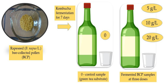 Kombucha is a well-known beverage produced through the fermentation of black or green tea (Camelia sinensis L.), although other types of tea can also serve as substrates [19]. Kombucha is slightly acidic and carbonated, which contributes to its popularity among consumers. It can be made as a low-alcohol beverage (similar to sparkling wine) or as a non-alcoholic drink (with less than 0.5% (v/v)) [19]. Kombucha offers several benefits for consumers, including the presence of different probiotic microbes (such as acetic acid bacteria), amino acids, phenolics from tea, sugars, organic acids, ethanol, water soluble vitamins, etc. [19]. There have been efforts to enhance the quality of BCP through fermentation processes using lactic acid bacteria (LAB) strains on an industrial pilot-scale level [20] including the application of kombucha [21,22]. However, data on kombucha fermentation of monofloral BCP are still lacking, including a detailed profile of bioactive compounds and the biological activity of the resulting kombucha pollen-enriched (KPE) beverage. The importance of using monofloral BCP lies in ensuring a relatively consistent chemical composition. Therefore, the aim of this research was to prepare a KPE beverage by fermenting monofloral rapeseed (Brassica napus L.) BCP. The selected samples (control and samples with the highest BCP addition) were subjected to detailed untargeted UHPLC Q-ToF-MS analysis to obtain a precise profile of phenolics and phenylamides, the most important bioactive constituents of BCP. In addition, the antioxidant properties and potential antimicrobial activity of the KPE beverage were evaluated. The findings of this study could be useful to future researchers in developing a novel functional beverage with enhanced bioactivity, which could be popular among consumers who strive toward a modern but healthier lifestyle.