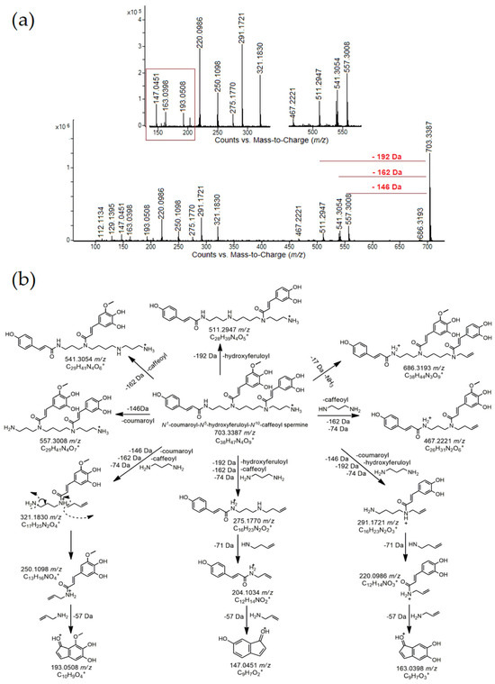 (a) Characteristic MS/MS fragmentation pattern (collision-induced dissociation (CID) mass spectra) and (b) proposed fragmentation pathway corresponding to N1-coumaroyl-N5-hydroxyferuloyl-N10-caffeoyl spermine (703 m/z) (Agilent, Q-ToF, ESI(+), CE = 30 eV).