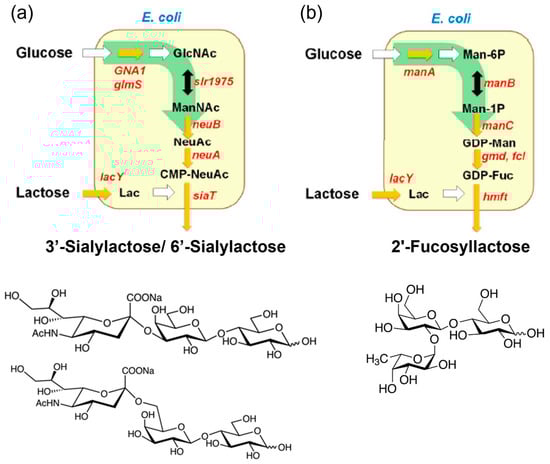 Industrial enzymatic production of human milk oligosaccharides. Biosynthetic pathway of (a) 3′-sialylactose/6′-sialylactose and (b) 2′-fucosyllactose from glucose and lactose (Lac). Sugar nucleotides, such as cytidine 5′-monophospho-N-acetylneuraminic acid (CMP-NeuAc) and guanosine diphosphate fucose (GDP-Fuc), are biosynthesized internally from glucose, and glycosyltransferases transfer the sugar moiety of the nucleotide sugar to lactose. (Reproduced with permission from [31]). Notes: GlcNAc: N-acetylglucosamine; ManNAc: N-acetylmannosamine; NeuNAc: N-acetylneuraminic acid; Man-6P: mannose 6-phosphate; Man-1P: mannose 1-phosphate; GDP-Man: guanosine pyrophosphate mannose.