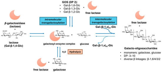 Illustration of the enzymatic production of galacto-oligosaccharides (GOSs) from lactose via hydrolysis and transgalactosylation reactions catalyzed by β-galactosidase (lactase). Note: DP—degree of polymerization.